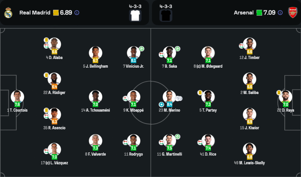 - แนวรุก: โรดรีโก้ (น.61 ออก เซบาญอส), วินิซิอุส จูเนียร์, คีลิยัน เอ็มบัปเป้ (น.75 ออก บราฮิม ดิอาซ)