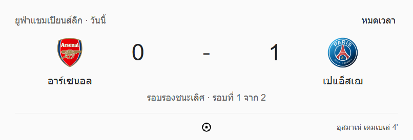 ศึกยูฟ่าแชมเปียนส์ลีก 2025 รอบรองชนะเลิศ นัดแรก ที่เอมิเรตส์ สเตเดี้ยม กลายเป็นค่ำคืนสุดช้ำของแฟนปืนใหญ่ เมื่ออาร์เซนอลต้องพ่ายคาบ้านให้กับปารีส แซงต์ แชร์กแมง ด้วยสกอร์ 0-1 จากประตูโทนของอุสมาน เดมเบเล่ตั้งแต่ต้นเกม บ้านกีฬา พาคุณเจาะลึกทุกเหตุการณ์ดุเดือดที่เกิดขึ้นในเกมนี้ พร้อมเกาะติด ผลบอลสด ทุกวินาทีแบบเรียลไทม์!