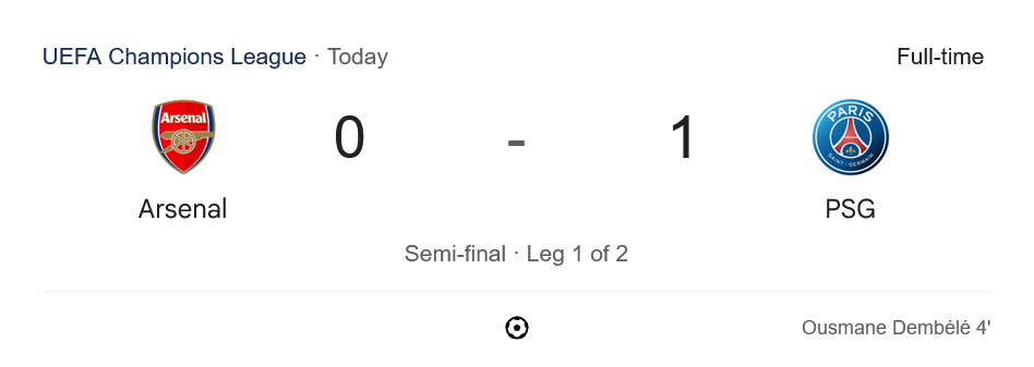 ชัยชนะของ PSG ในเกมนี้ทำให้พวกเขากุมความได้เปรียบก่อนจะกลับไปเล่นเลกสองที่บ้านตัวเอง โดยอาร์เซนอลจะต้องเปิดเกมรุกเพื่อทวงประตูคืนให้ได้อย่างน้อยหนึ่งลูกเพื่อหวังต่อลมหายใจในศึก UCL ปีนี้ หากเปแอสเชยันเสมอได้ในเลกถัดไป พวกเขาจะเข้าสู่รอบชิงทันที