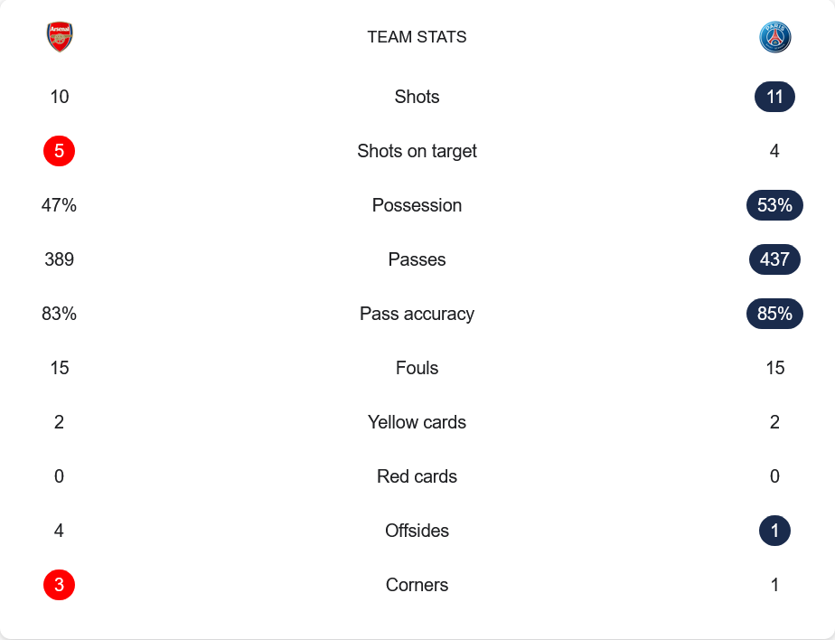 เกมนี้อาร์เซนอลครองบอลได้ 47% ขณะที่เปแอสเชครองบอล 53% ตลอดทั้งเกม ทีมเยือนจ่ายบอลได้แม่นยำกว่าที่ 85% จากจำนวน 437 ครั้ง ส่วนอาร์เซนอลจ่ายได้ 389 ครั้ง คิดเป็นความแม่นยำ 83% ด้านโอกาสยิง อาร์เซนอลยิงรวม 10 ครั้ง เข้ากรอบ 5 ส่วนเปแอสเชยิงมากกว่าที่ 11 ครั้ง เข้ากรอบ 4 ทั้งสองทีมทำฟาวล์เท่ากันที่ 15 ครั้ง มีใบเหลืองฝั่งละ 2 ใบ เตะมุมอาร์เซนอลได้ 3 ครั้ง ขณะที่เปแอสเชได้แค่ 1 ครั้ง