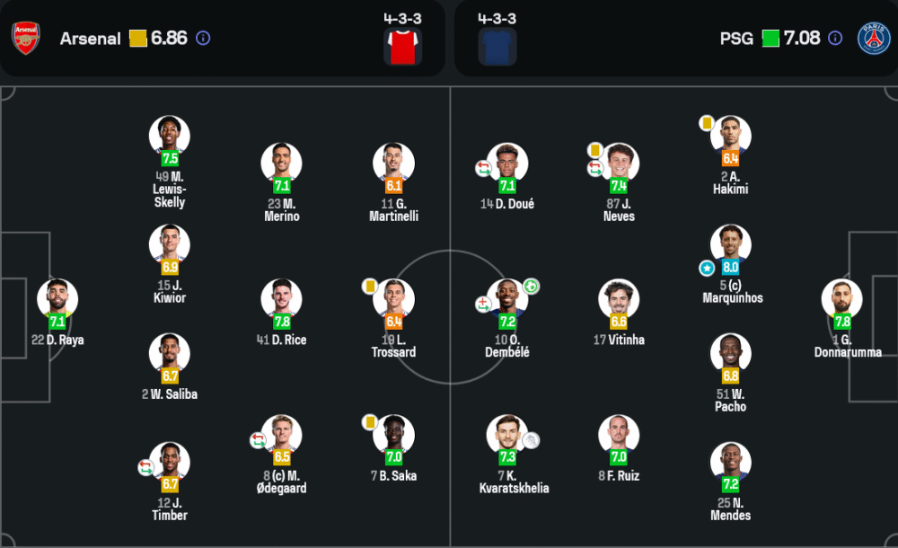 - อาร์เซนอล: เดแคลน ไรซ์ (7.8), ไมลส์ ลูอิส-สเคลลี่ (7.5), ดาบิด รายา (7.1)