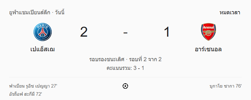 อาร์เซนอลมีโอกาสหลายครั้งแต่ไม่เด็ดขาดพอ ขณะที่ เปแอสเช ใช้จังหวะน้อยกว่าแต่เปลี่ยนเป็นประตูได้คมกว่า โดยเฉพาะ Fabián Ruiz ที่ยิงเบิกร่องอย่างสุดคม และ Hakimi ที่ปิดบัญชีแบบไม่ลังเล ด้าน ผลบอลสด สะท้อนให้เห็นภาพชัดเจนว่าเกมนี้เต็มไปด้วยคุณภาพและความเร็วระดับสูงจากทั้งสองฝั่ง แต่สุดท้ายเป็นเจ้าถิ่นที่รักษาความนิ่งไว้ได้จนคว้าชัย