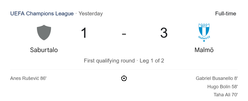 บ้านกีฬา พาแฟนบอลติดตาม ผลบอลสด สุดเดือดเมื่อคืนที่ผ่านมา ศึกยูฟ่าแชมเปียนส์ลีก รอบคัดเลือก รอบแรก เลกแรก มัลโม่บุกไปเยือนอิเบเรีย 1999 และโชว์ฟอร์มแกร่งไล่กดเจ้าถิ่น 3-1 โดยได้ประตูจาก กาเบรียล บุซาเนลโล นาทีที่ 8, ฮูโก้ โบลิน นาทีที่ 58 และทาฮา อาลี นาทีที่ 70 ส่วนอิเบเรียมาได้ประตูตีไข่แตกในช่วงท้ายเกมจาก อาเนส รุเซวิช นาทีที่ 86 ทำให้มัลโม่กุมความได้เปรียบก่อนกลับไปปิดงานในเลกสองที่บ้านตัวเอง