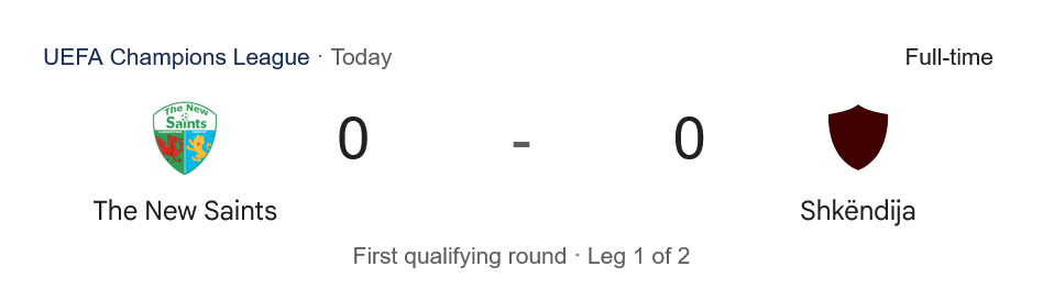 บ้านกีฬา พาเกาะติดศึกยูฟ่าแชมเปียนส์ลีก รอบคัดเลือก รอบแรก เลกแรก ที่สนามของ เดอะ นิว เซนต์ส จบลงด้วยผล บ้านผลบอล แบบไม่มีใครยิ้มออก เมื่อเจ้าถิ่นเสมอกับ ชเคนดิย่า ไปแบบไร้สกอร์ 0-0 แต่เต็มไปด้วยจังหวะตึงเครียดและใบเหลืองมากมาย เกมนี้ทำให้ต้องไปลุ้นกันต่อในเลกสองที่บ้านของ ชเคนดิย่า กลางสัปดาห์หน้า