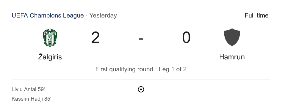 ศึก ยูฟ่าแชมเปียนส์ลีก รอบคัดเลือก รอบแรก เลกแรก เมื่อคืนที่ผ่านมา ซัลกิริส โชว์ฟอร์มดุดันเปิดรังเชือด ฮัมรุน สปาร์ตันส์ 2-0 ตามรายงาน ผลบอลสด จากบ้านผลบอล เกมนี้ลูกทีมของวลาดิเมียร์ เชบูริน คุมเกมได้เหนือกว่าตลอดทั้ง 90 นาที และยิงประตูในครึ่งหลังจาก ลิวิอู อันตัล และ คาสซิม ฮัดจิ สร้างความได้เปรียบก่อนบุกไปเยือนเลกสองที่มอลตา