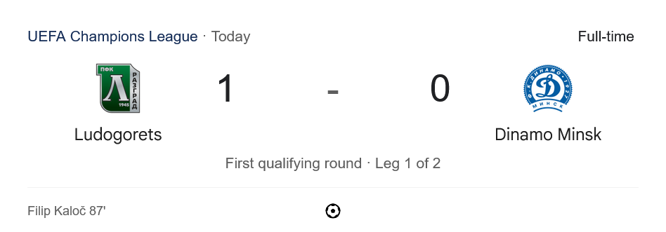 ศึก ยูฟ่าแชมเปียนส์ลีก รอบคัดเลือก รอบแรก เลกแรก ที่บัลแกเรีย ลูโดโกเร็ตส์เฉือนเอาชนะดินาโม มินส์ค แบบสุดระทึก 1-0 จากประตูสำคัญของ ฟิลิป คาโลช ในช่วงท้ายเกม บ้านกีฬาเกาะติด ผลบอลสด ตลอด 90 นาที และต้องบอกว่าเกมนี้เจ้าถิ่นกดดันคู่แข่งได้หนักหน่วงจนคว้าความได้เปรียบก่อนเลกสอง