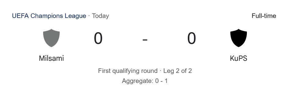 บ้านกีฬา รายงาน ผลบอลสด ยูฟ่าแชมเปียนส์ลีก รอบคัดเลือก รอบแรก เลกสอง เมื่อคืนนี้ มิลซามี่ เปิดบ้านหวังพลิกสถานการณ์รับมือคูพีเอส ทีมแกร่งจากฟินแลนด์ หลังเกมแรกพ่ายมา 0-1 เกมนี้เจ้าถิ่นเปิดเกมรุกเต็มที่แต่สุดท้ายเจาะไม่เข้า เสมอกันไปแบบไร้สกอร์ 0-0 ส่งผลให้คูพีเอสผ่านเข้ารอบต่อไปด้วยสกอร์รวม 1-0