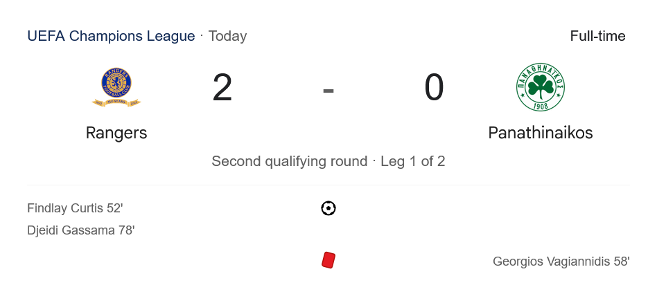 ชัยชนะนัดนี้ทำให้เรนเจอร์สกุมความได้เปรียบในรอบคัดเลือกรอบสองด้วยสกอร์ 2-0 ก่อนออกไปเยือนพานาธิไนกอสในเลกสอง ส่วนทีมจากกรีซต้องยิงคืนอย่างน้อยสองประตูเพื่อไปต่อ