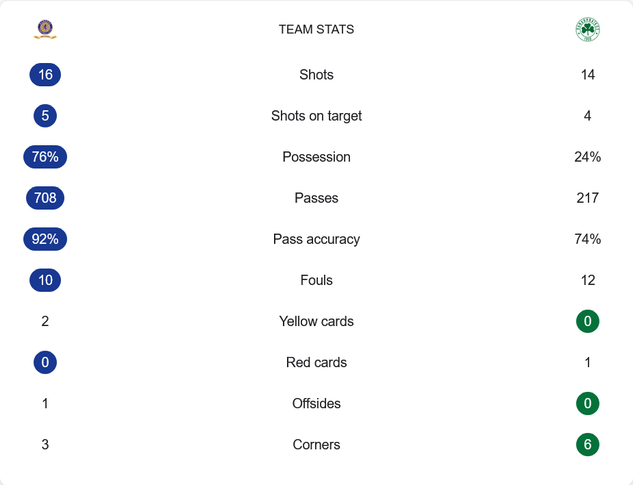เกมนี้เรนเจอร์สโชว์ความเหนือกว่าทุกด้าน ครองบอลถึง 76% จ่ายบอลแม่นถึง 92% และมีโอกาสยิงมากกว่า 16 ต่อ 14 ครั้ง แต่เข้ากรอบมากกว่าชัดเจน การคุมจังหวะและการเพรสซิ่งของเจ้าบ้านทำให้พานาธิไนกอสเสียบอลหลายครั้งและไม่สามารถเล่นเกมรุกได้ตามที่วางแผนมา
