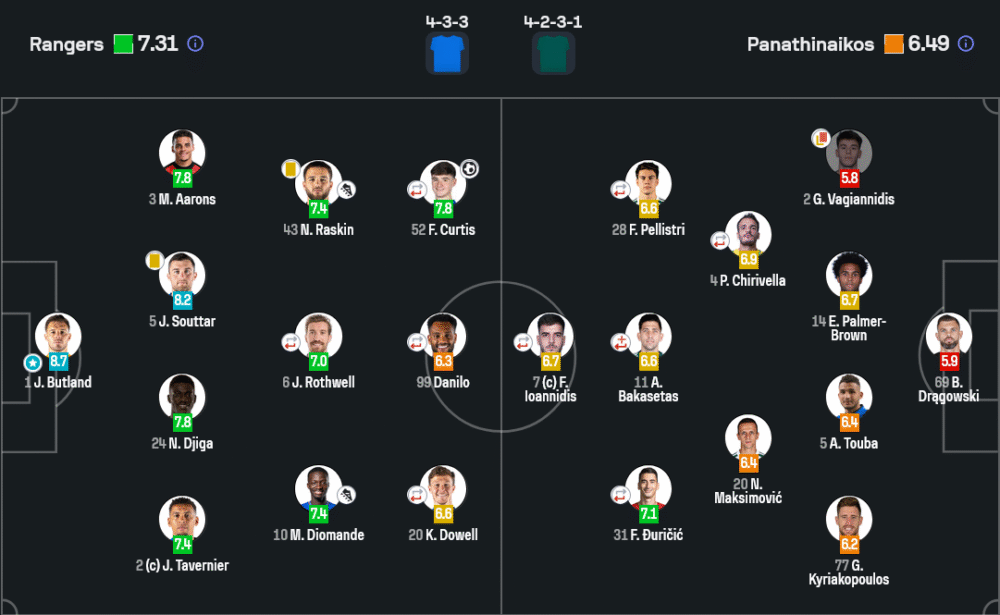 เมื่อวิเคราะห์บอลตามรูปเกม เรนเจอร์สมาในแผน 4-3-3 ที่เน้นครองบอลบุกตลอดทั้งเกม พวกเขาเพรสซิ่งสูง ปล่อยให้สองฟูลแบ็คเติมเกมริมเส้นตลอด ส่วนแดนกลางขยับกดดันตั้งแต่ครึ่งสนามจนพานาธิไนกอสเสียจังหวะบ่อยครั้ง ฝั่งทีมเยือนใช้แผน 4-2-3-1 ที่เน้นตั้งโซนรับต่ำและรอโต้กลับ แต่เมื่อเหลือ 10 คนก็แทบหมดลุ้นเพราะเสียทั้งพื้นที่และจังหวะโต้กลับ