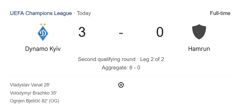 ตาม ตารางบอล นัดถัดไป ดินาโม เคียฟ จะพบกับผู้ชนะระหว่าง Pafos FC หรือ Maccabi Tel Aviv ในรอบคัดเลือกรอบสามของยูฟ่าแชมเปียนส์ลีก วันที่ 6 สิงหาคม 2568 ขณะที่ ฮัมรุน เตรียมกลับไปเปิดบ้านในลีกมอลตาพบกับ Tarxien Rainbows วันที่ 17 สิงหาคมนี้