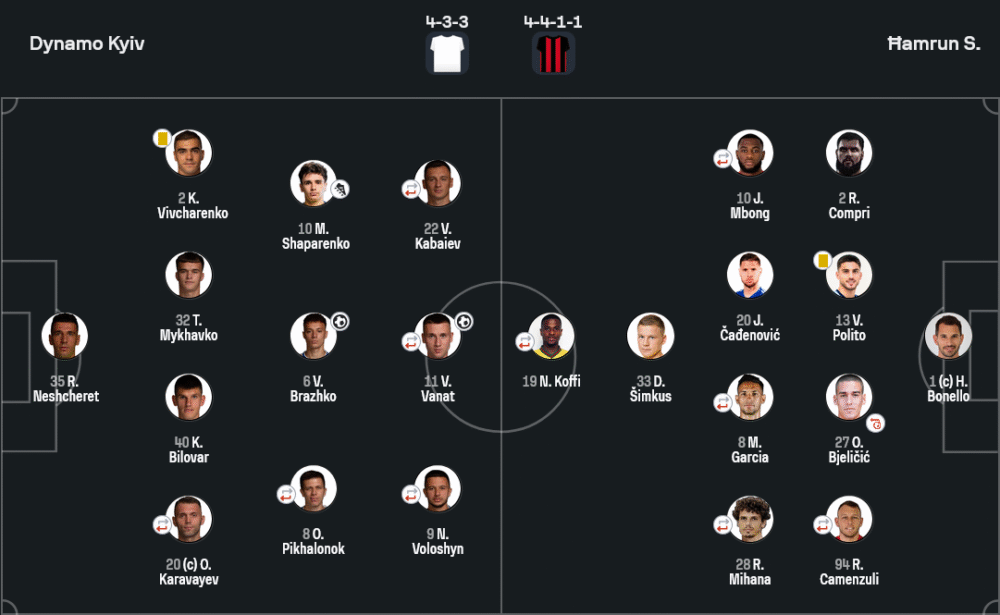 ส่วน ฮัมรุน สปาร์ตันส์ ใช้ระบบ 4-4-1-1 ซึ่งเน้นการแพ็กเกมรับและรอโต้กลับ แต่ปัญหาคือพวกเขาไม่สามารถขึ้นบอลพ้นแดนตัวเองได้เลย เมื่อเจอการเพรสซิ่งเร็วและการประสานงานที่แม่นยำของดินาโม เคียฟ ในด้าน วิเคราะห์บอล แล้ว เกมนี้แสดงให้เห็นชัดว่าเคียฟเหนือกว่าทุกมิติ ทั้งแท็กติก ความฟิต และประสบการณ์ในเวทียุโรป