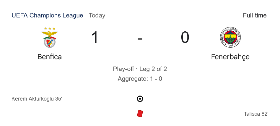 ศึกยูฟ่าแชมเปียนส์ลีก รอบเพลย์ออฟนัดสอง เบนฟิก้า เปิดบ้านเฉือนเอาชนะ เฟเนร์บาห์เช่ 1-0 โดยได้ประตูโทนจาก เคเร็ม อัคเติร์กโอกลู นาทีที่ 35 ก่อนเกมจะเต็มไปด้วยความเข้มข้นและดราม่าจากใบแดงของ อันแดร์สัน ทาลิสก้า ในนาที 82 ส่งผลให้รวมสองนัด เบนฟิก้า เข้ารอบด้วยสกอร์รวม 1-0 บ้านกีฬา พาไปเจาะลึกเกมนี้พร้อม ผลบอลสด ที่เข้มข้นถึงอารมณ์