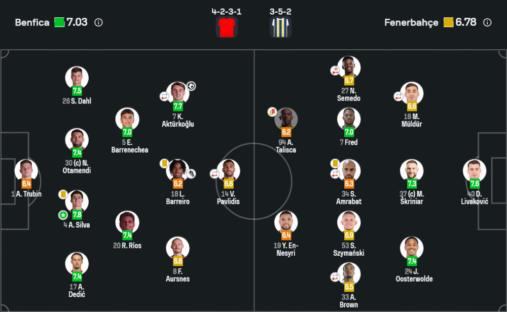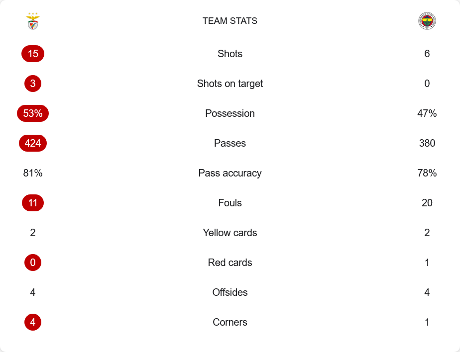 ตลอด 90 นาที เบนฟิก้า มีโอกาสยิง 15 ครั้ง เข้ากรอบ 3 ส่วน เฟเนร์บาห์เช่ ยิงได้เพียง 6 ครั้ง และไม่มีลูกเข้ากรอบเลย การครองบอลเจ้าถิ่นเหนือกว่า 53% ต่อ 47% ผ่านบอลแม่นยำ 81% ขณะที่ทีมเยือนแม่นเพียง 78% ฟาวล์เกิดขึ้นรวม 31 ครั้ง โดย เฟเนร์บาห์เช่ ทำถึง 20 ฟาวล์ แสดงให้เห็นถึงความกดดันที่ต้องรับมือเกมบุกของ เบนฟิก้า