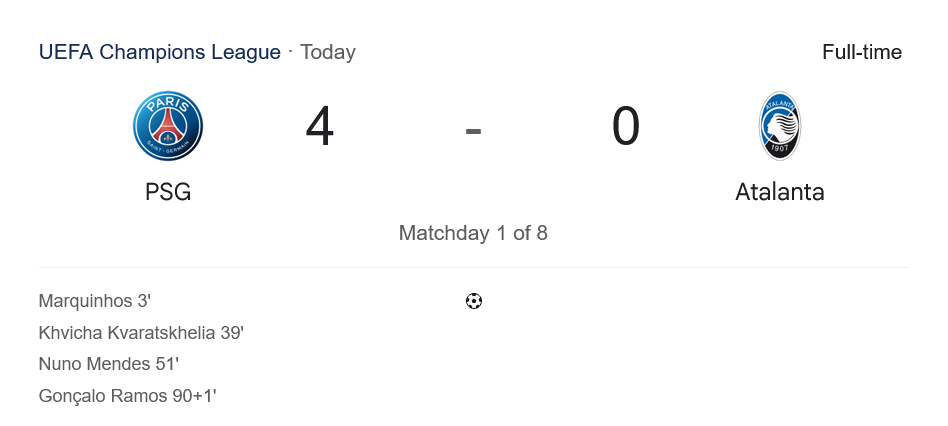 ชัยชนะนี้ส่งให้ PSG ขึ้นจ่าฝูงกลุ่มทันทีด้วย 3 แต้มเต็ม และผลต่างประตูได้เสีย +4 ทำให้ได้เปรียบเหนือคู่แข่งร่วมกลุ่ม ส่วนอตาลันต้ารั้งบ๊วยของกลุ่มด้วยความพ่ายแพ้เละเทะ หากไม่รีบปรับเกมรับมีโอกาสตกรอบสูง