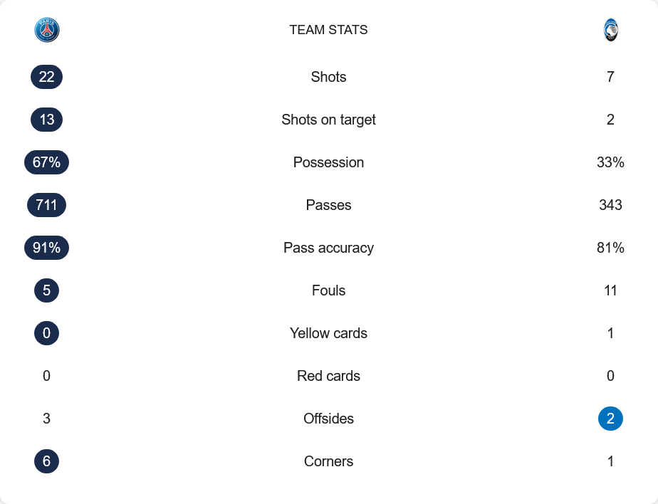 กลับมาครึ่งหลัง PSG ไม่ผ่อนเกม นาที 51 นูโน่ เมนเดส ซัดเต็มข้อทำให้สกอร์ขยับเป็น 3-0 และช่วงทดเจ็บนาที 90+1 กอนซาโล่ รามอส ตัวสำรองลงมายิงปิดท้ายให้ทีมถล่ม 4-0 แบบเด็ดขาด อตาลันต้าหมดสภาพทั้งเกมรุกและเกมรับ ไม่สามารถสร้างแรงกดดันได้เลย