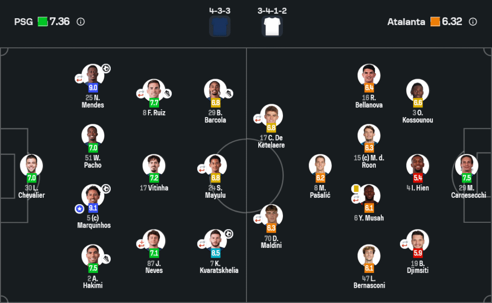 ผู้เล่นยอดเยี่ยมของเกมคือ มาร์ควินญอส ที่ไม่เพียงทำประตูเบิกร่องสำคัญ แต่ยังคุมแนวรับได้อย่างแข็งแกร่ง เรตติ้งสูงถึง 9.1 สะท้อนถึงฟอร์มระดับโลกที่เป็นหัวใจสำคัญพา PSG เก็บชัยชนะอย่างเหนือชั้น