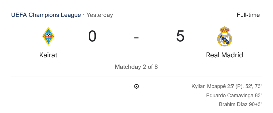 ช่วงท้ายเกม มาดริดยังไม่หยุด นาที 83 เอดูอาร์โด้ คามาวิงก้า ซัดเพิ่มอีกลูก และทดเจ็บนาที 90+3 บราฮิม ดิอาซ ยิงปิดกล่อง สกอร์สุดท้าย เรอัล มาดริด บุกอัด ไครัต 5-0 แบบเหนือชั้น