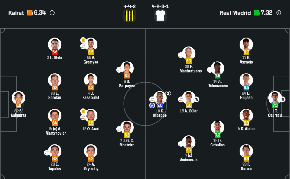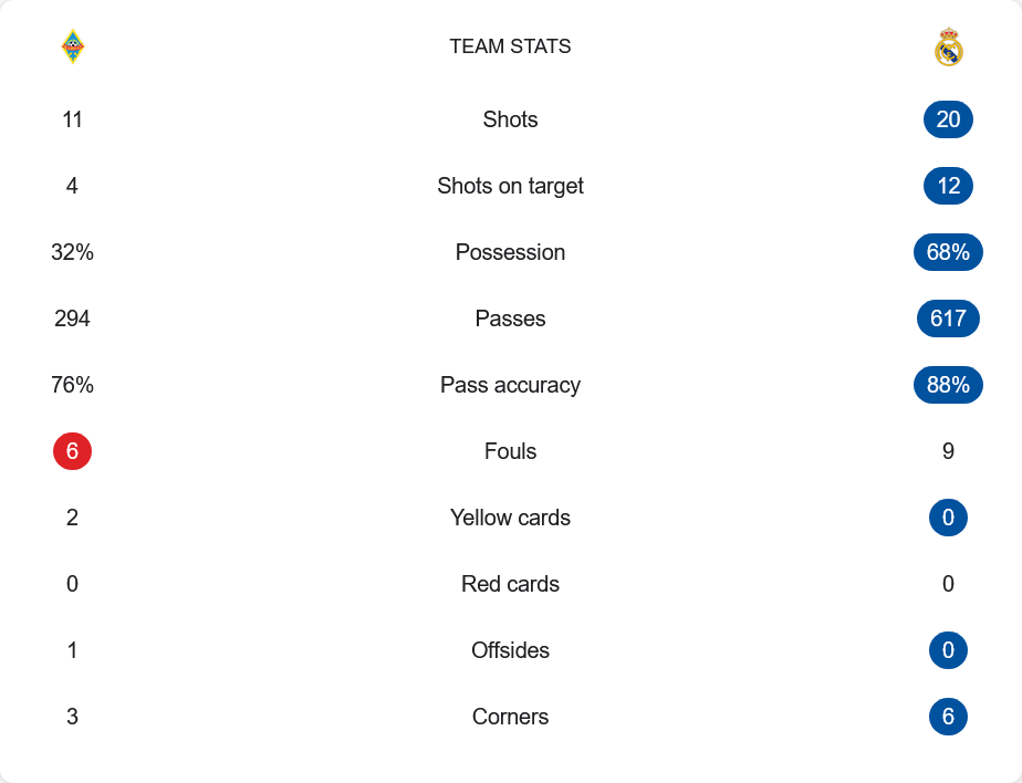 แม้ไครัตจะพยายามสู้ แต่ตัวเลขสะท้อนชัดว่าเกมนี้คือการครองของราชันชุดขาว มาดริดครองบอลถึง 68% ผ่านบอล 617 ครั้ง ความแม่นยำ 88% ยิงทั้งหมด 20 ครั้ง เข้ากรอบ 12 ครั้ง และเปลี่ยนเป็น 5 ประตูเต็มๆ ส่วนไครัตได้โอกาสเพียง 11 ครั้ง เข้ากรอบแค่ 4 เกมรับและแดนกลางถูกกดดันตลอดจนต่อเกมไม่ได้ มาดริดไม่มีใบเหลือง ส่วนเจ้าถิ่นได้ถึง 2 ใบ เกมนี้สะท้อนคุณภาพที่แตกต่างอย่างชัดเจน