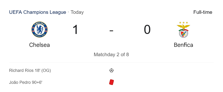 การแข่งขันฟุตบอล ยูฟ่า แชมเปียนส์ลีก นัดที่ 2 ของรอบแบ่งกลุ่มเมื่อคืนนี้ “สิงโตน้ำเงินคราม” เชลซี คืนฟอร์มเก็บชัยชนะในถิ่น สแตมฟอร์ด บริดจ์ หลังเปิดบ้านเฉือนเอาชนะ เบนฟิก้า ไปด้วยสกอร์ 1-0 จากลูกทำเข้าประตูตัวเองของ ริชาร์ด ริออส ในนาทีที่ 18 พร้อมอัปเดต ผลบอลสด และความเคลื่อนไหวล่าสุดจากเกมที่เต็มไปด้วยดราม่าใบแดงช่วงทดเจ็บของ เจา เปโดร ในนาที 90+6