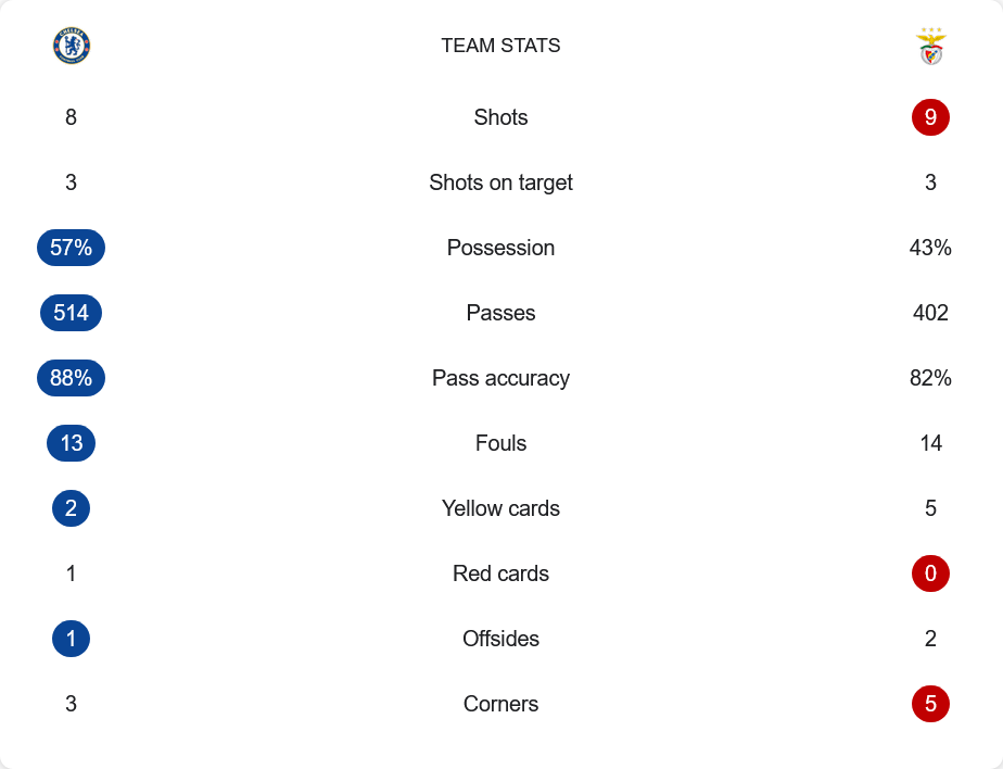 แม้เบนฟิก้าจะมีลูกเตะมุมมากกว่า 5 ต่อ 3 แต่ความแม่นยำในการส่งบอลของเชลซีสูงกว่า 88% ต่อ 82% แสดงให้เห็นถึงความนิ่งและการคอนโทรลบอลที่ดีกว่า