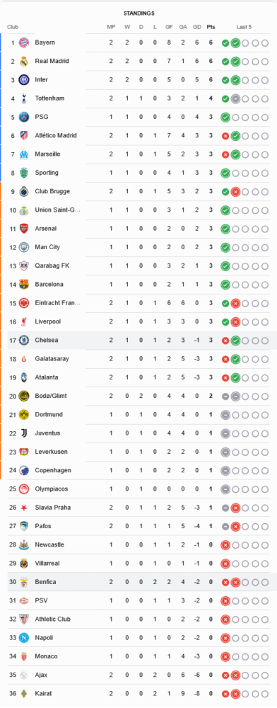 หลังจบเกมนี้ เชลซี เก็บเพิ่ม 3 คะแนน ขยับขึ้นมาอยู่ที่อันดับ 17 ของตารางรวม มี 3 คะแนนจาก 2 นัด ขณะที่ เบนฟิก้า ยังรั้งอันดับ 30 จากผลงานแพ้ 2 นัดรวด ไม่มีคะแนน