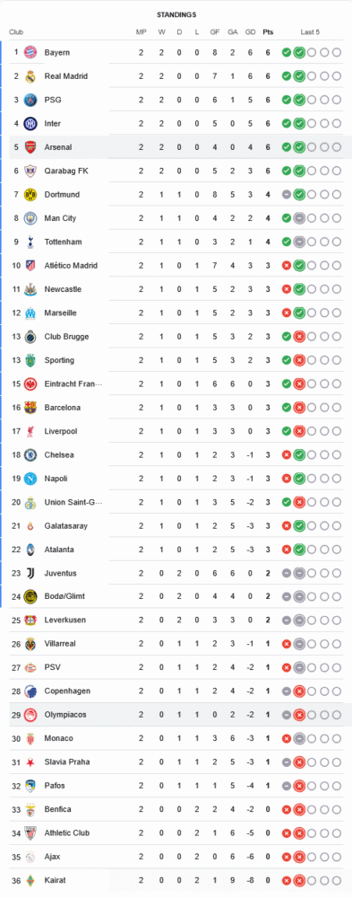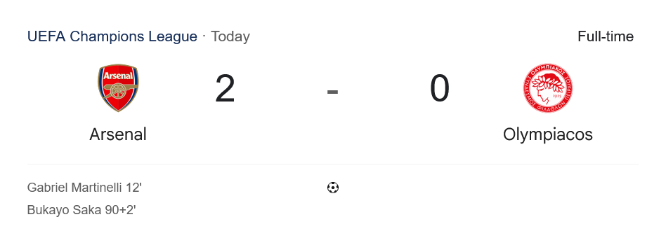 สามคะแนนนัดนี้พา อาร์เซนอล เก็บ 6 แต้มเต็มจาก 2 เกม รักษาที่นั่งหัวตารางกลุ่ม พร้อมความได้เปรียบเรื่องผลต่างประตู ส่วน โอลิมเปียกอส ที่ยังมือเปล่า/แต้มติดลบในผลต่าง ต้องเร่งเครื่องทันทีหากไม่อยากหลุดวงโคจรลุ้นเข้ารอบน็อกเอาต์