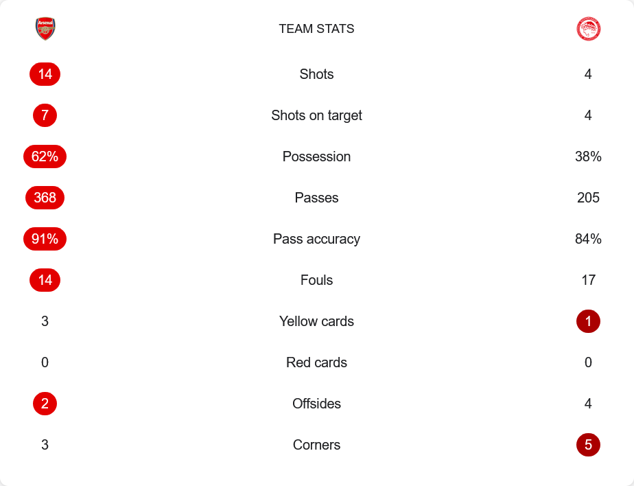 รูปเกมสะท้อนชัด อาร์เซนอลครองบอลมากกว่า ยิงรวมมากกว่า โอกาสลุ้นใสสะอาดต่อเนื่อง การผ่านบอลของเจ้าถิ่นต่อเนื่องแม่นยำกว่า 9 ใน 10 ครั้ง ทำให้ทีมเยือนไม่ค่อยได้ตั้งลำ เกมทางฝั่งขวาของโอลิมเปียกอสรับศึกหนักตลอดและต้องตัดฟาวล์แก้สถานการณ์บ่อย จังหวะเซ็ตเพลย์ของทีมเยือนแม้ได้เตะมุมมากกว่า แต่ไร้ทีเด็ดเพราะการยืนป้องกันโซนของอาร์เซนอลรัดกุม