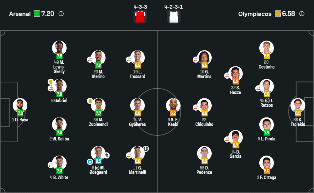 - เปลี่ยนตัวสำคัญ: จูรเรียน ทิมเบอร์ ↔️ ไวท์ (68′), ไรซ์ ↔️ เมรีโน (68′), ซาก้า ↔️ ทรอสซาร์ด (73′), อีเบเรชี เอเซ ↔️ มาร์ติเนลลี (73′), คายเซโด/มอสเกรา ↔️ กาเบรียล (75′)