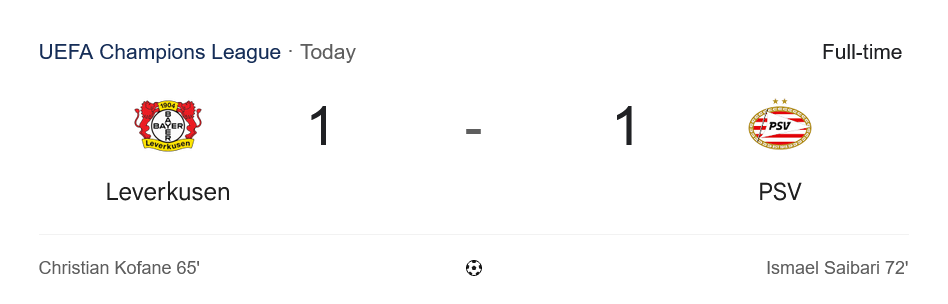 บ้านกีฬาเกาะติด ผลบอลสด จากถ้ำไบอารีน่า เกมเดือดของกลุ่มนี้ลงเอยด้วยการแบ่งแต้ม ไบเออร์ เลเวอร์คูเซิน เสมอ พีเอสวี ไอนด์โฮเฟ่น 1-1 เจ้าถิ่นขึ้นนำก่อนจาก คริสเตียน โกฟาเน่ นาที 65 แต่พีเอสวีไม่ยอมแพ้ อิสมาเอล ไซบารี ยิงตีเสมอ นาที 72 กอดคอรับหนึ่งแต้มแบบลมหายใจหายใจรดต้นคอ