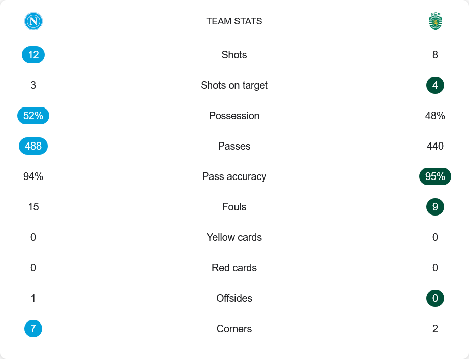 จ่ายบอล: นาโปลี 488 ครั้ง (แม่นยำ 94%) – สปอร์ติ้ง 440 ครั้ง (แม่นยำ 95%)