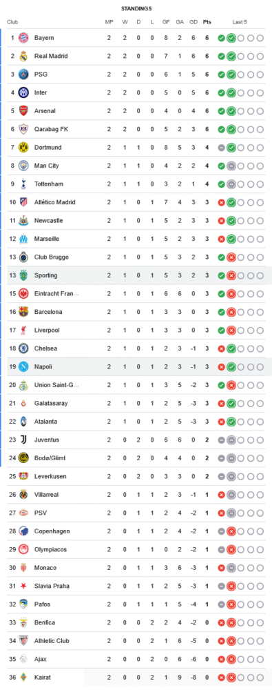 นาโปลีเก็บชัยแรกในรอบแบ่งกลุ่ม มี 3 คะแนนจาก 2 นัด ยังมีโอกาสลุ้นเข้ารอบเต็มตัว ส่วนสปอร์ติ้ง ลิสบอน มี 3 คะแนนเช่นกันจาก 2 นัด ผลต่างประตูยังคงดี (+3) แต่ต้องระวังหากสะดุดเพิ่มในเกมต่อไปเพราะสถานการณ์กลุ่มยังสูสี