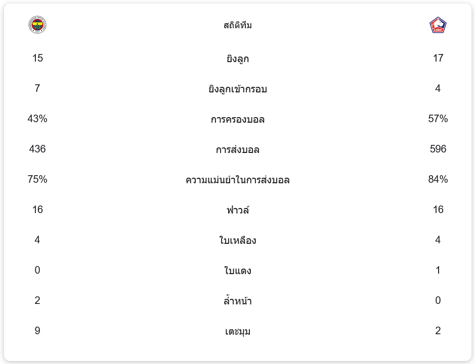 ทีม เฟเนร์บาห์เช่ มีการยิงทั้งหมด 15 ครั้ง โดยยิงเข้ากรอบ 7 ครั้ง พวกเขาครองบอลได้ 43% และมีการส่งบอลทั้งหมด 436 ครั้งด้วยความแม่นยำ 75% การทำฟาวล์ทั้งหมด 16 ครั้ง ได้รับใบเหลือง 4 ใบ ไม่มีใบแดง ได้เตะมุม 9 ครั้ง และล้ำหน้า 2 ครั้ง