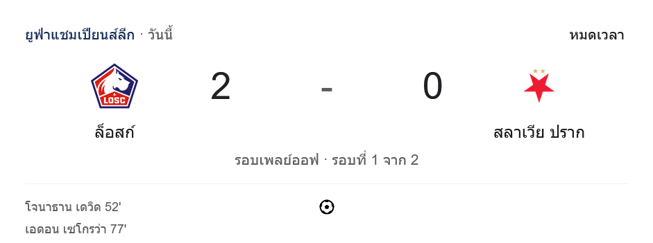 การแข่งขันฟุตบอล ยูฟ่าแชมเปียนส์ลีก 2024 รอบเพลย์ออฟ นัดแรก ระหว่าง ลีลล์ จากฝรั่งเศส เปิดบ้านรับการมาเยือนของ สลาเวีย ปราก จากเช็ก จบลงด้วยชัยชนะของเจ้าถิ่นที่คว้าชัยไปได้อย่างสมศักดิ์ศรี 2-0 โดยที่ทีมเยือนต้องกลับบ้านไปด้วยความผิดหวัง