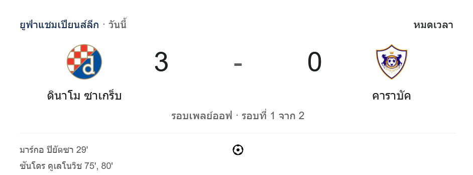 การแข่งขันฟุตบอล ยูฟ่าแชมเปียนส์ลีก 2024 รอบเพลย์ออฟ นัดแรก ระหว่าง ดินาโม ซาเกร็บ ทีมดังจากโครเอเชีย พบกับ คาราบัค จากอาเซอร์ไบจาน จบลงด้วยชัยชนะที่ยิ่งใหญ่ของทีมเจ้าถิ่นด้วยสกอร์ 3-0 ที่สนามเหย้าของดินาโม ซาเกร็บ