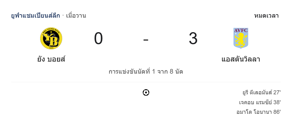 ผลบอลยูฟ่าแชมเปียนส์ลีก 2024 ระหว่าง ทีมยัง บอยส์ vs ทีมแอสตัน วิลล่า วันนี้ 18/9/67 ดูบอลย้อนหลัง คลิปไฮไลท์ ดูบอลยูฟ่าแชมเปียนส์ลีก 2024