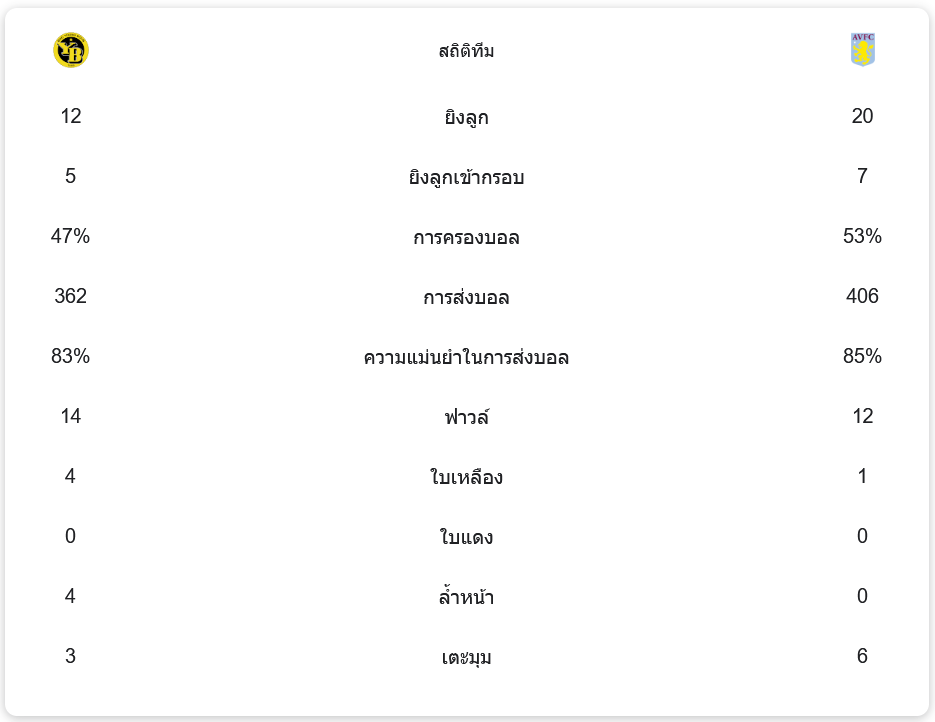 สถิติการแข่งขัน ในเกมนี้ ยัง บอยส์มีโอกาสยิงทั้งหมด 12 ครั้ง เข้ากรอบ 5 ครั้ง ขณะที่แอสตัน วิลล่ามีโอกาสยิง 20 ครั้ง และเข้ากรอบ 7 ครั้ง การครองบอลเป็นของแอสตัน วิลล่ามากกว่าที่ 53% ส่วนยัง บอยส์ครองบอลได้ 47% ทีมเยือนยังทำการส่งบอลได้มากถึง 406 ครั้ง มีความแม่นยำ 85% ส่วนยัง บอยส์ส่งบอลได้ 362 ครั้ง ด้วยความแม่นยำ 83% นอกจากนี้ ยัง บอยส์ฟาวล์ไป 14 ครั้งและได้รับใบเหลือง 4 ใบ ขณะที่แอสตัน วิลล่าฟาวล์ไป 12 ครั้งและได้ใบเหลือง 1 ใบ