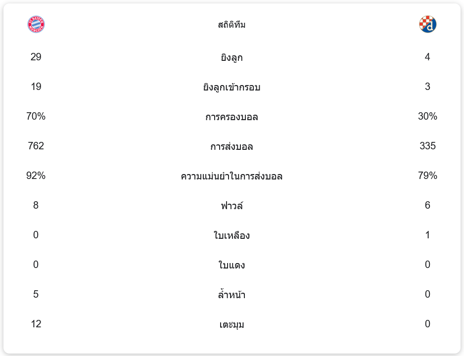 สถิติการแข่งขัน บาเยิร์น มิวนิคครองเกมได้มากถึง 70% และมีโอกาสยิงถึง 29 ครั้ง เข้ากรอบ 19 ครั้ง ขณะที่ดินาโม ซาเกร็บครองบอลได้เพียง 30% และมีโอกาสยิงเพียง 4 ครั้ง เข้ากรอบ 3 ครั้ง บาเยิร์นยังมีความแม่นยำในการผ่านบอลสูงถึง 92% จากการส่งบอลทั้งหมด 762 ครั้ง ขณะที่ดินาโม ซาเกร็บมีความแม่นยำเพียง 79% จากการส่งบอล 335 ครั้ง