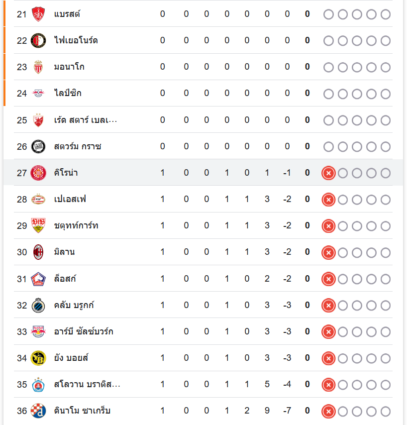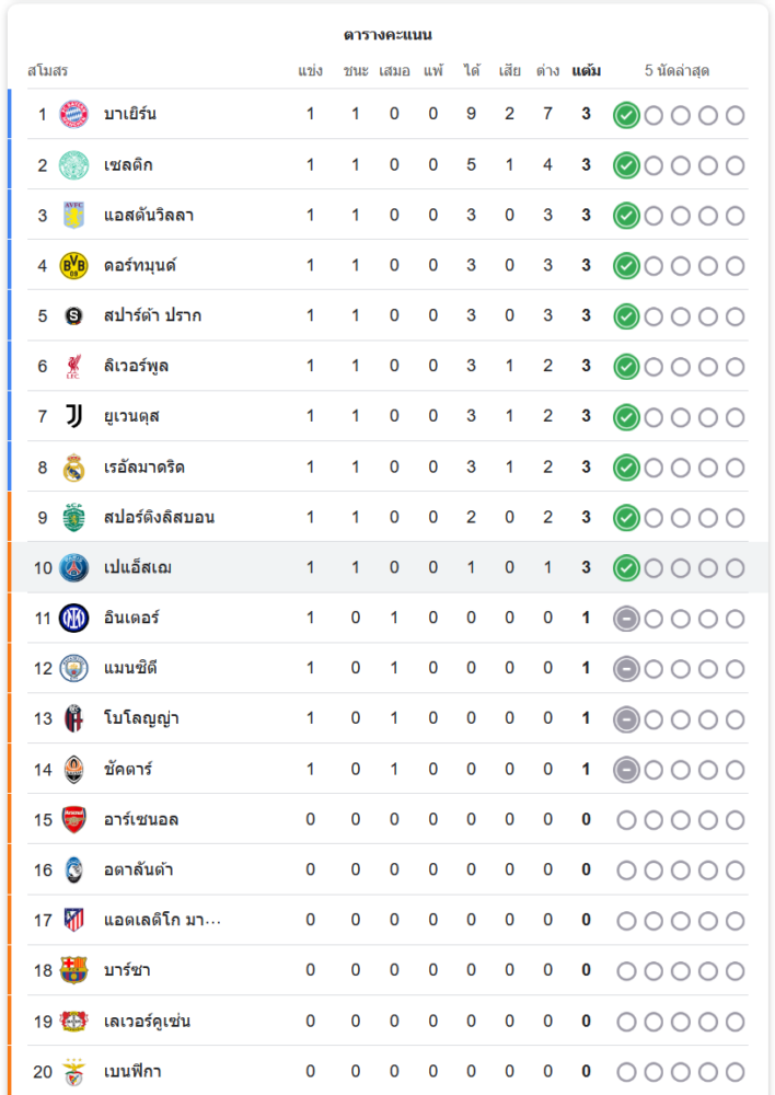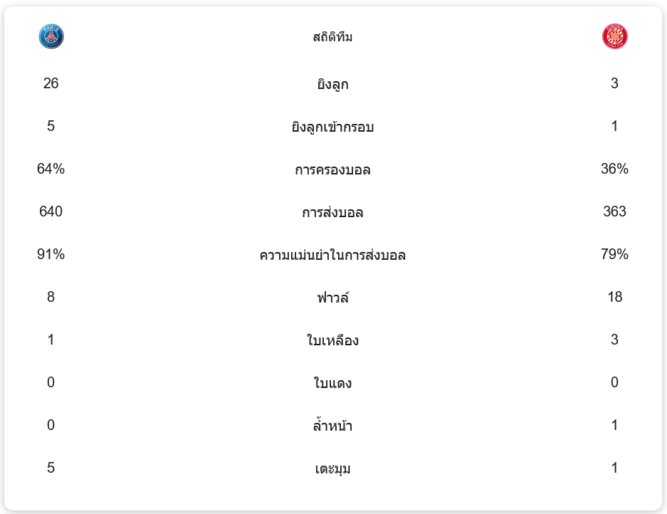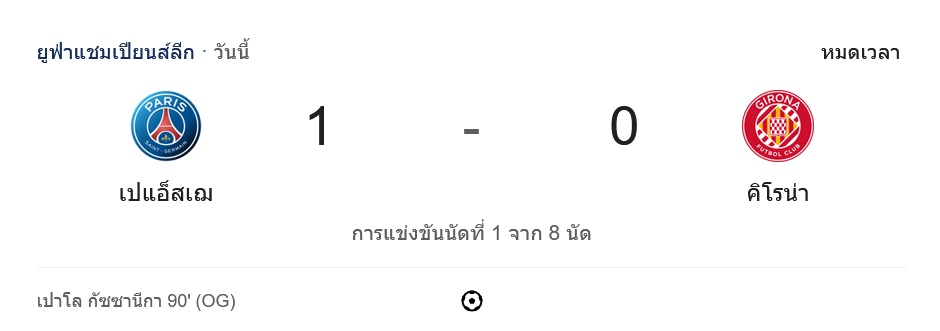 - 90+1′: เปาโล กัซซานิกา ผู้รักษาประตูคิโรน่า ทำเข้าประตูตัวเองให้ปารีสชนะ 1-0
