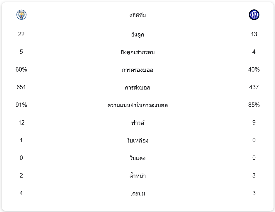 แมนเชสเตอร์ ซิตี้ ครองบอลได้มากกว่า 60% และมีโอกาสยิงถึง 22 ครั้ง โดยยิงเข้ากรอบ 5 ครั้ง ส่วน อินเตอร์ มิลาน มีโอกาสยิง 13 ครั้ง ยิงเข้ากรอบ 4 ครั้ง แมนเชสเตอร์ ซิตี้ส่งบอลสำเร็จ 651 ครั้ง ด้วยความแม่นยำถึง 91% ส่วนอินเตอร์ มิลานส่งบอลสำเร็จ 437 ครั้ง ด้วยความแม่นยำ 85% ทั้งสองทีมทำฟาวล์รวมกันถึง 21 ครั้ง โดยแมนเชสเตอร์ ซิตี้ทำฟาวล์ 12 ครั้งและได้รับใบเหลือง 1 ใบ ขณะที่อินเตอร์ทำฟาวล์ 9 ครั้ง