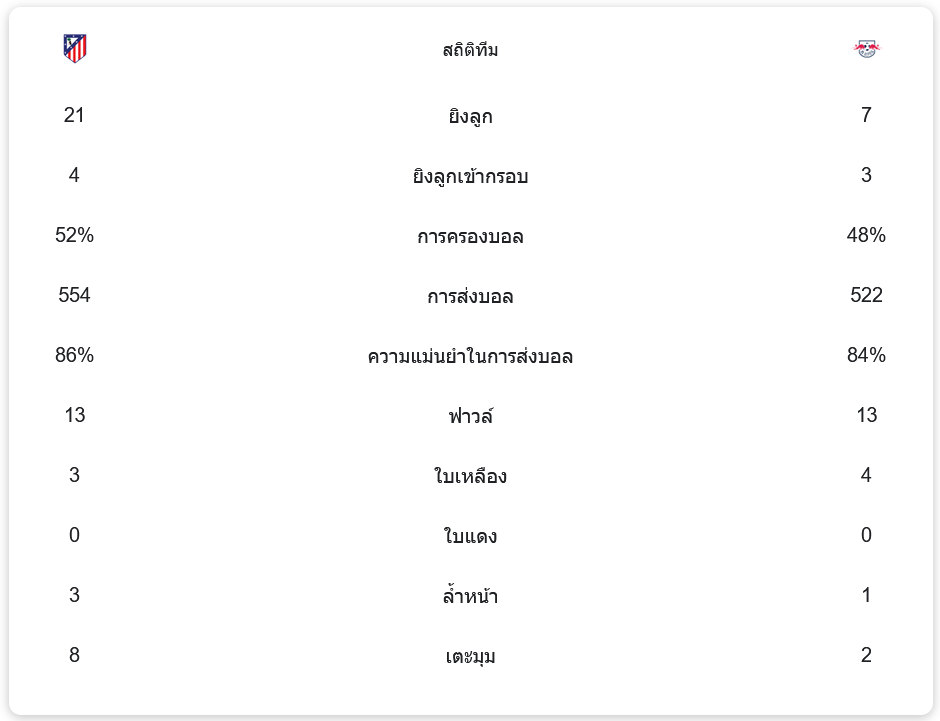 แอตเลติโก้ มาดริดมีโอกาสยิงถึง 21 ครั้ง โดยเข้ากรอบ 4 ครั้ง ส่วนไลป์ซิกมีโอกาสยิง 7 ครั้ง และเข้ากรอบ 3 ครั้ง อัตราการครองบอลค่อนข้างสูสี โดยแอตเลติโก้ครองบอลได้ 52% ขณะที่ไลป์ซิกครองบอลได้ 48% การส่งบอลของทั้งสองทีมมีความแม่นยำพอๆ กัน โดยแอตเลติโก้ส่งบอลได้สำเร็จ 86% และไลป์ซิกส่งบอลสำเร็จ 84%