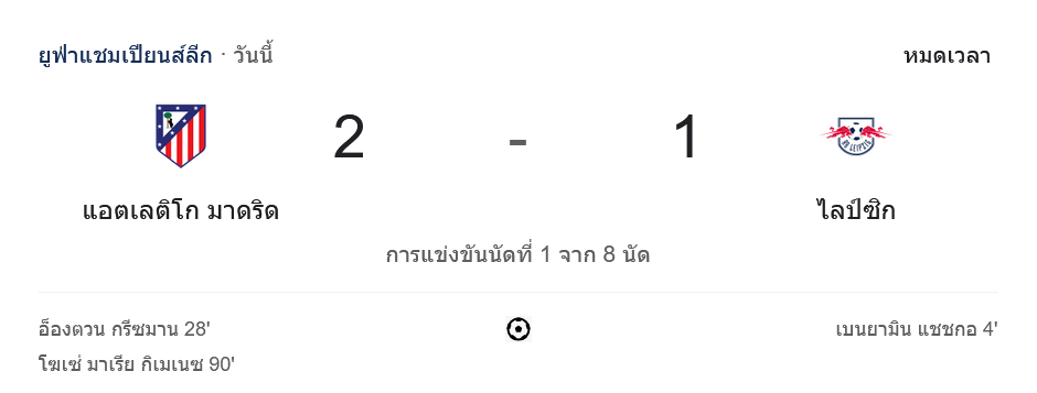 ผลบอลยูฟ่าแชมเปียนส์ลีก 2024 ระหว่าง แอตเลติโก้ มาดริด 2-1 แอร์เบ ไลป์ซิก วันนี้ 20/9/67