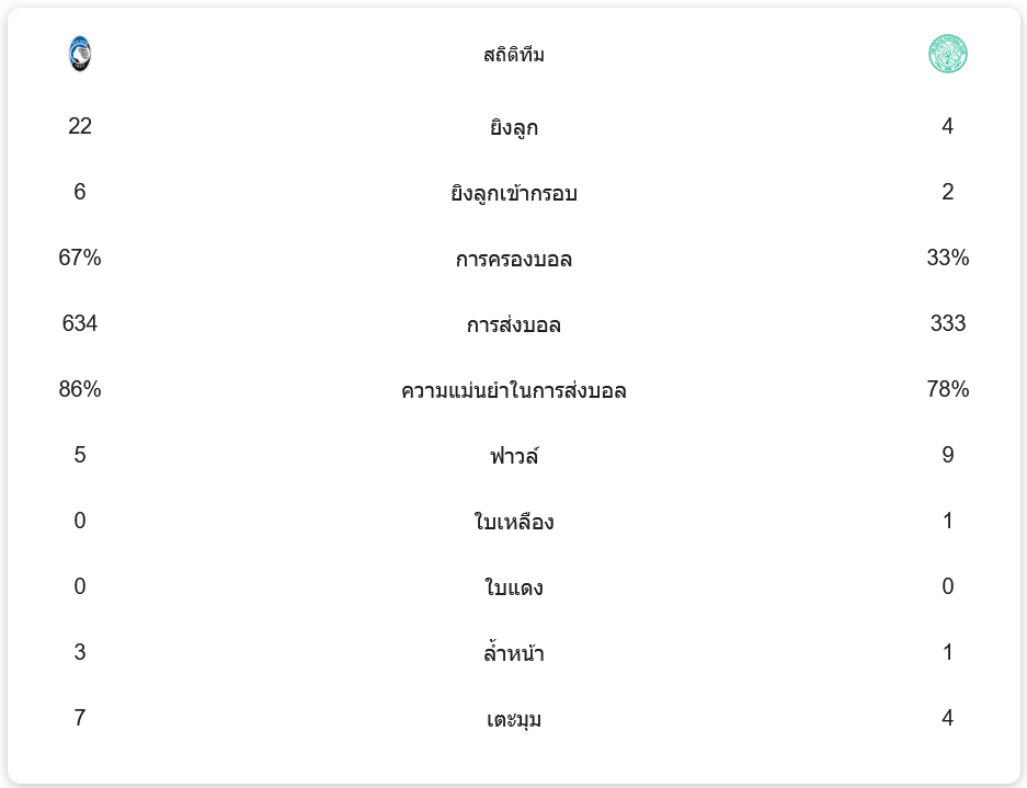 สถิติการแข่งขัน: อตาลันต้าครองเกม แต่เซลติกป้องกันได้แข็งแกร่ง