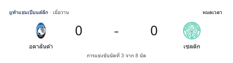 การแข่งขันฟุตบอลยูฟ่า แชมเปี้ยนส์ ลีก 2024 รอบแบ่งกลุ่ม นัดที่ 3 ระหว่าง อตาลันต้า จากอิตาลี และ เซลติก จากสกอตแลนด์ จบลงด้วยผลเสมอ 0-0 ทั้งสองทีมต่างมีความพยายามในการทำเกมบุก แต่ไม่สามารถเจาะตาข่ายได้ ทำให้แบ่งแต้มกันไปคนละ 1 คะแนน