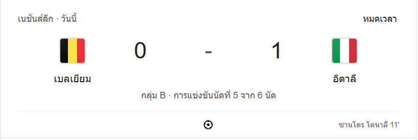 แม้ว่าเบลเยียมจะพยายามโจมตีอย่างหนักในครึ่งหลัง แต่แนวรับของอิตาลีก็สามารถยืนหยัดได้อย่างยอดเยี่ยม สุดท้ายทีมเยือนคว้าชัยไปด้วยสกอร์ 1-0 เก็บสามแต้มสำคัญในยูฟ่าเนชันส์ลีกได้อย่างงดงาม