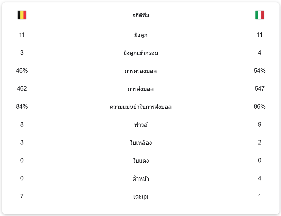 แม้ทั้งสองทีมจะมีโอกาสยิงเท่ากันที่ 11 ครั้ง แต่การจบสกอร์ของอิตาลีคมกว่าด้วยการยิงเข้ากรอบ 4 ครั้ง ขณะที่เบลเยียมยิงเข้ากรอบเพียง 3 ครั้ง อิตาลีครองบอลมากกว่าเล็กน้อยที่ 54% และมีการผ่านบอลแม่นยำถึง 86% ส่วนเบลเยียมมีความแม่นยำในการผ่านบอล 84%