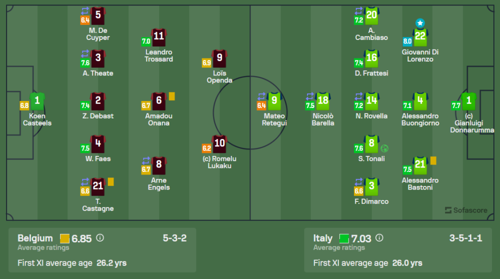เบลเยียมมาในแผน 5-3-2 เน้นการเล่นเกมรับและสวนกลับ โดยใช้ความเร็วของปีกทั้งสองข้าง ขณะที่อิตาลีใช้แผน 3-5-1-1 ซึ่งเน้นการครองบอลในแดนกลางและการบุกจากด้านข้าง การใช้ซานโดร โตนาลีในแดนกลางเป็นกุญแจสำคัญของอิตาลีที่ทำให้เกมรุกดุดันและมีประสิทธิภาพ