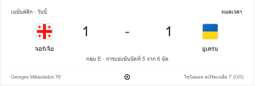 การแข่งขันฟุตบอลยูฟ่าเนชันส์ลีก 2024 ระหว่าง จอร์เจีย กับ ยูเครน จบลงด้วยผลเสมอ 1-1 แม้ว่า ยูเครน จะได้ประตูขึ้นนำจากการทำเข้าประตูตัวเองของจอร์เจียตั้งแต่ต้นเกม แต่ทีมเจ้าบ้านก็ไม่ยอมแพ้และพยายามสู้จนสามารถตีเสมอได้สำเร็จจาก จอร์จส์ มิกัวทัดเซ เกมนี้เต็มไปด้วยความดุเดือดและการเล่นที่ไม่ยอมลดละทั้งสองฝ่าย ทำให้เป็นอีกหนึ่งแมตช์ที่แฟนบอลต้องจดจำ