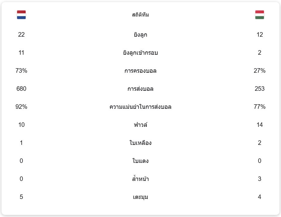 เนเธอร์แลนด์ครองบอลถึง 73% มีการยิงทั้งหมด 22 ครั้ง โดยยิงเข้ากรอบ 11 ครั้ง ในขณะที่ฮังการีมีโอกาสยิงเพียง 12 ครั้งและเข้ากรอบ 2 ครั้ง การจ่ายบอลของทีมดัตช์แม่นยำถึง 92% สร้างความแตกต่างในเกม ส่วนฮังการีมีการส่งบอลแม่นยำเพียง 77% และมีการฟาวล์มากถึง 14 ครั้ง ทำให้ทีมเยือนต้องเหนื่อยรับมือกับเกมบุกตลอดทั้งเกม