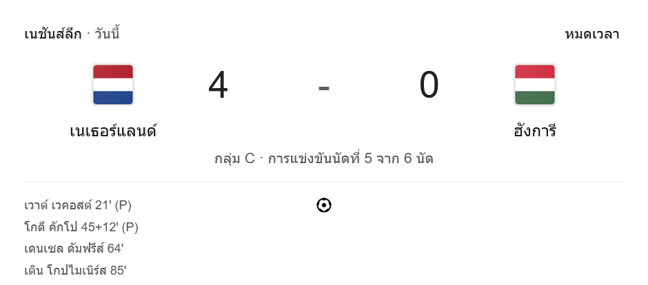 ผลบอลสดจากศึกยูฟ่าเนชันส์ลีก 2024 กลุ่ม C เนเธอร์แลนด์โชว์ฟอร์มโหดเปิดบ้านถล่มฮังการี 4-0 ด้วยการเล่นที่ยอดเยี่ยมและพลังการบุกที่ไม่มีใครหยุดได้ เกมนี้เดนเซล ดุมฟรีส์เป็นดาวเด่น โชว์ฟอร์มสุดยอดและได้รับรางวัลผู้เล่นยอดเยี่ยม บ้านผลบอลรายงานว่าการแข่งขันนี้แสดงให้เห็นถึงความเหนือกว่าของทีมดัตช์ในทุกด้านทั้งการครองบอลและการจบสกอร์